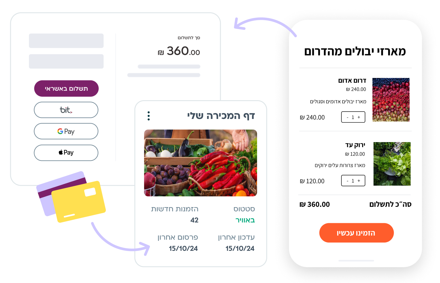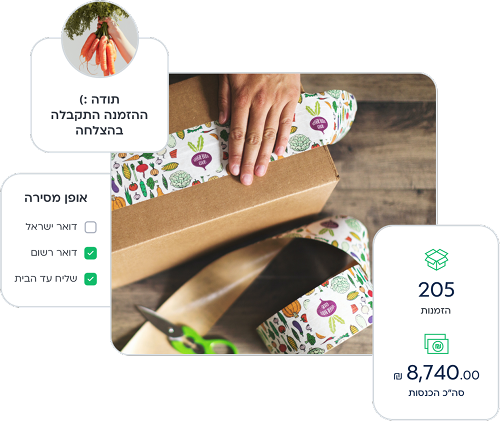 כל מה שצריך כדי לנהל דף מכירה מוצלח, מרוכז ומנוהל במקום אחד: חשבוניות אוטומטיות, ניהול הזמנות וסליקה, שליטה באפשרויות השילוח ועוד המון הגדרות שהופכות את ניהול העמוד לפשוט ונוח.