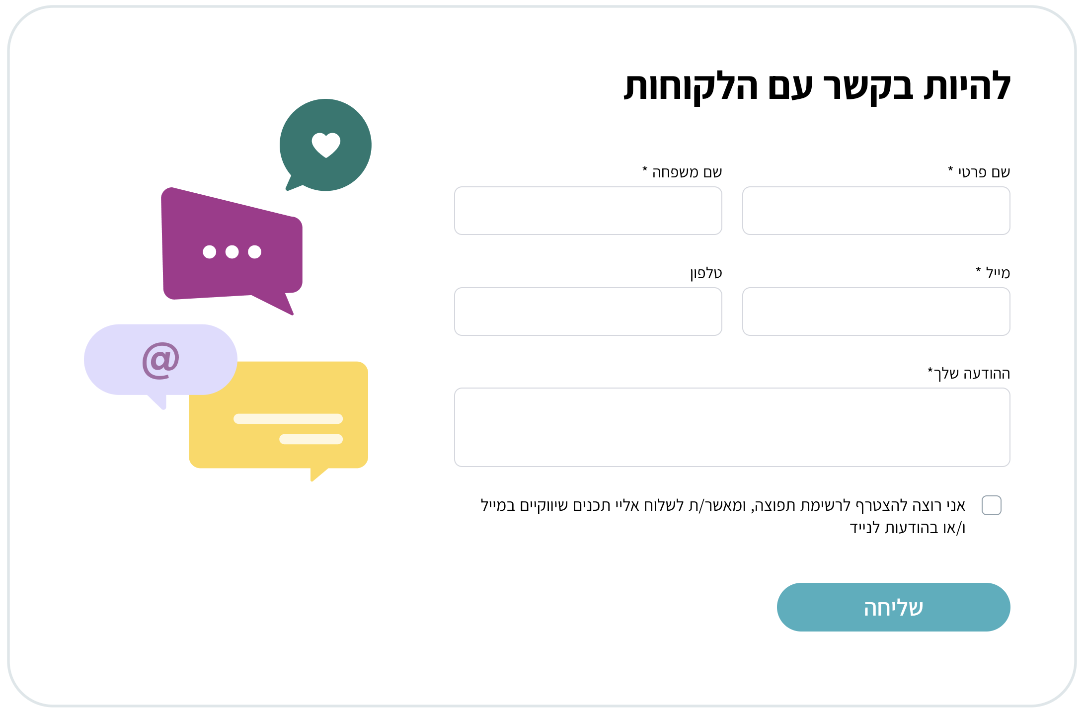 פחות בעניין של מכירה ישירה? דף המכירה כולל גם בלוק ליצירת קשר המאפשר למבקרים בעמוד להשאיר פרטים. אפשר לאסוף לידים, להציע הצטרפות לרשימת דיוור, לקבל שאלות או פניות מלקוחות ועוד.